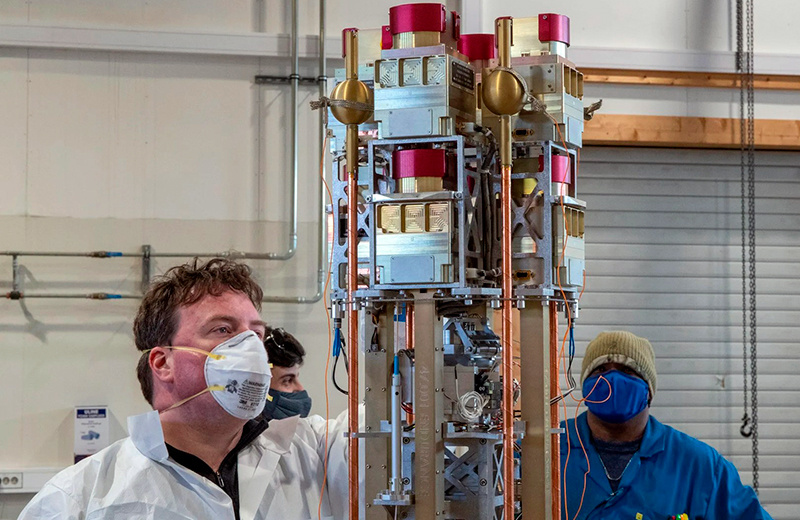 Глин Коллинсон осматривает прибор, который будет использоваться для обнаружения электрического потенциала, связанного с электрическим полем Земли. Во время полета он разворачивался, выдвигая восемь стрел с датчиками.