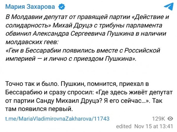 Официальный представитель МИД РФ Мария Захарова ответила ироничным постом в своём Telegram-канале. «В Молдавии депутат от правящей партии «Действие и солидарность» Михай Друцэ с трибуны парламента обвинил Александра Сергеевича Пушкина в наличии молдавских геев*: «Геи* в Бессарабии появились вместе с Российской империей — и лично с приездом Пушкина». Точно так и было. Пушкин, помнится, приехал в Бессарабию и сразу спросил: «Где здесь живёт депутат от партии Санду Михаил Друцэ? Я его сейчас…». Так там появился первый«, — написала Захарова.
