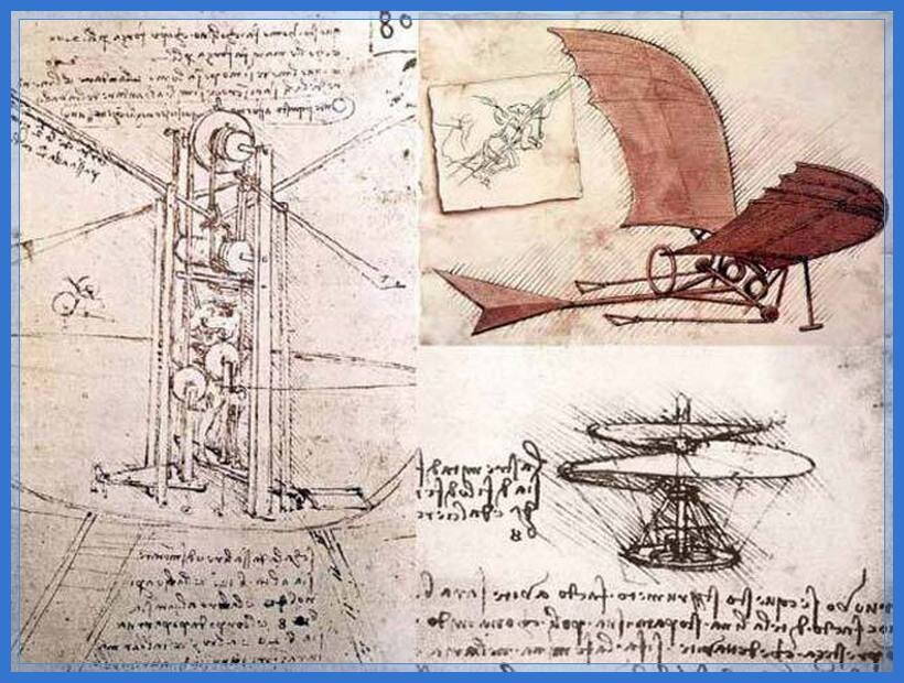 Гений Леонардо да Винчи, на своих чертежах уже в то время изображал вертолет и подводную лодку.