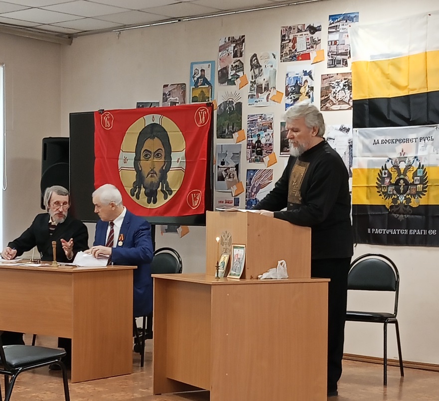 Следующим докладчиком был Михаил Иванович Рубцов, член Союза писателей России, член Совета РПО «Отчизна». Он прочитал доклад «Богатыри духа. От прошлого к грядущему». Доклад начинался словами: «Чин святости предполагает не только праведную жизнь человека, но и высшую степень этой праведности – уподобиться Богу в жертвенном служении Истине. Об этом уподоблении Сам Господь сказал такие слова: «Нет больше той любви, как если кто положит душу свою за друзей своих» (Ин. 15:13).